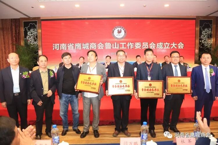 2018年4月1日,河南省鹰城商会鲁山工作委员会成立大会在郑州正方元锦江国际饭店成功举行。河南省鹰城商会总顾问、河南省质量技术监督局原局长高德领,河南省工商局副局长陶洪臻,中共鲁山县委书记杨英锋,许昌军分区副司令员王东伟,河南投资集团财务总监闫万鹏,河南省计量研究院院长王晓伟,河南省质检院院长傅小苗,鲁山县政府副县长曲延辉,鲁山县政协副主席、工商联主席李斌,鲁山县扶贫办主任陈英健,鲁山县委办公室副主任杜军,鲁山县招商局局长郭明星,鲁山县张官营镇党委书记李新杰,河南省鹰城商会会长王献军,副会长郑朝选、郭爱国、朱志伟,郑州市工商联副主席、郑州市钢贸商会会长黄涛及近两百家鲁山籍会员单位出席本次会议。大会由河南省鹰城商会秘书长耿保全主持。