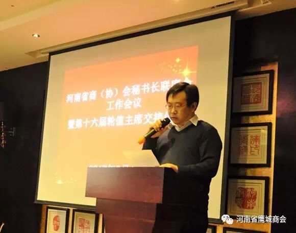 陈国刚副主席代表秘书长联席会主席办公会对河南省商(协)会秘书长联席会成立情况及工作运转情况向与会代表作介绍。河南省商(协)会秘书长联席会是由在河南省民政厅、郑州市民政局登记注册的商(协)的秘书长组建的一个机制性的非盈利民间团体,由河南省湖北商会、川渝商会、安徽商会、浙江商会、山西商会、湖南商会等商会秘书长发起设立的秘书长联系会会议组织。会上,第十五届轮值主席——河南省民营企业家协会秘书长刘俊峰总结了十五届秘书长联席会的工作。