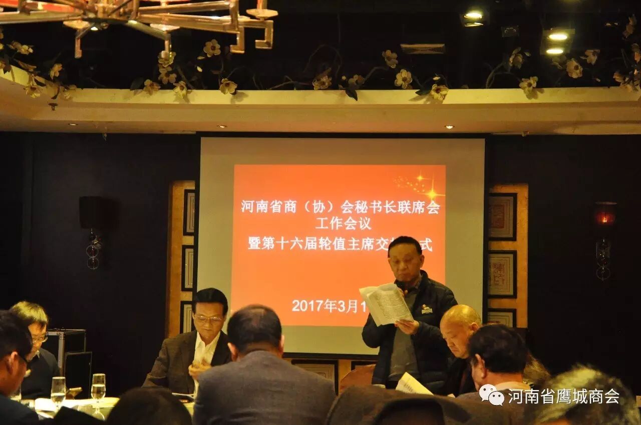 2017年3月11日,河南省商(协)会秘书长联席会工作会议暨第十六届轮值主席交接仪式在郑州市庖厅堂酒店举行,来自我省异地商会、区域商会、行业商(协)会秘书长30余人及洛阳市洛阳新区招商与融资促进局副局长李毅军、洛阳市伊滨区管委会副主任王光耀、河南省鹰城商会常务副会长张有伦、常务副秘书长吴延召、副秘书长张要邦等出席本次会议。会议由河南省河南省商(协)会秘书长联席会副主席、河南省上海商会秘书长陈国刚主持。